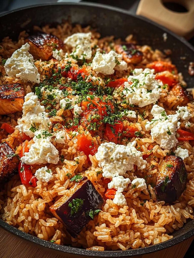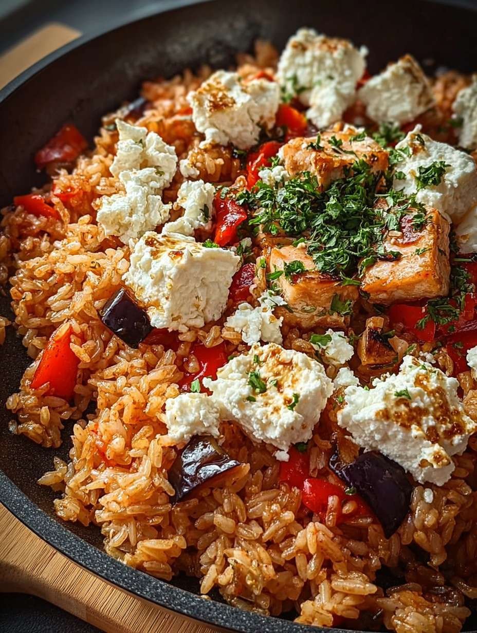 Diese Reispfanne ist nicht nur lecker, sondern auch ein Fest für die Augen. Die lebhaften Farben der Zutaten machen jedes Gericht zu einem echten Highlight auf dem Tisch. Besonders die zarte Auberjine kombiniert mit dem cremigen Feta verleiht der Pfanne eine besondere Note.