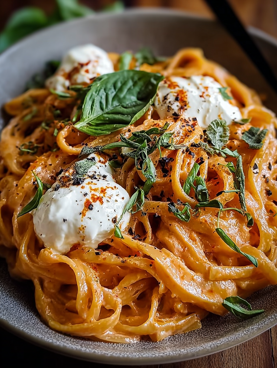 Cremige Pasta mit roter Paprika, Burrata und Kräutern