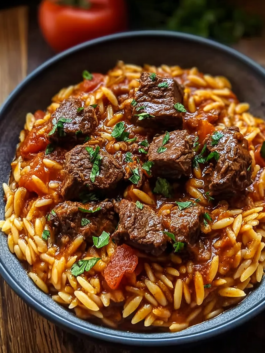 Rezept für Beef Giouvetsi (griechische Rindfleisch-Orzo-Pasta).