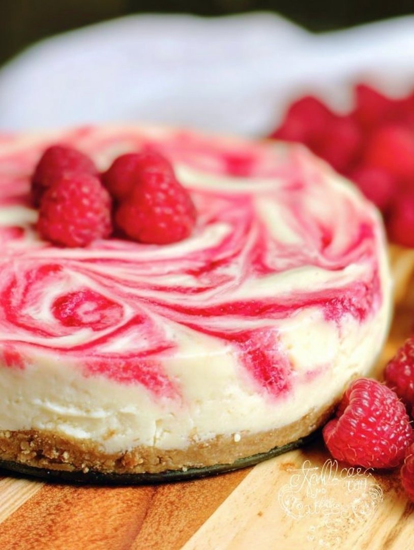 Käsekuchen mit weißer Schokolade und Himbeeren