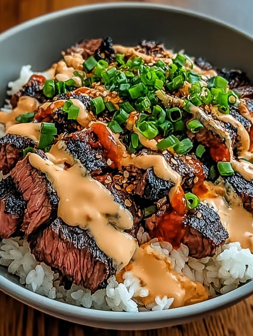 Koreanische BBQ-Steak-Reisschüsseln mit scharfer Sahnesauce
