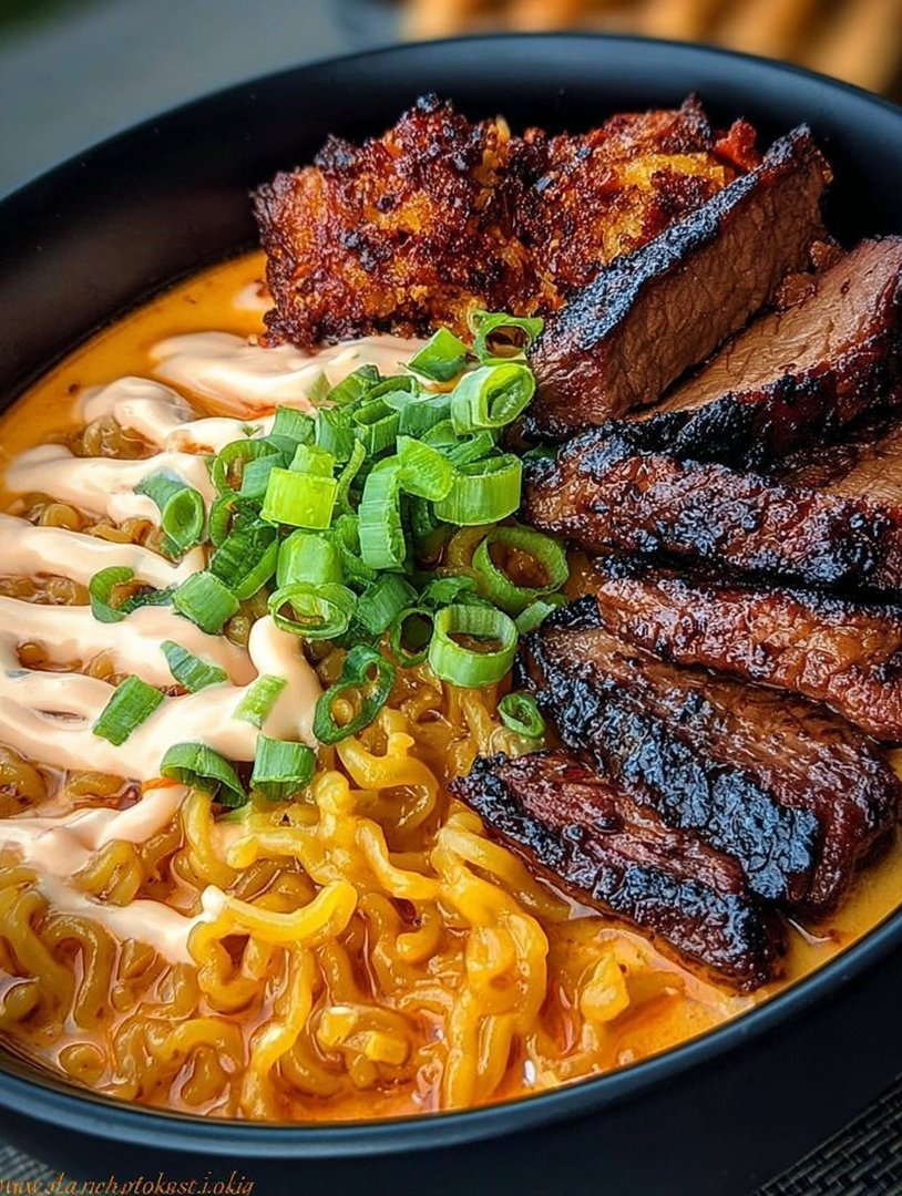 Scharfe koreanische Ramen mit gegrilltem Rindfleisch und cremiger Sauce