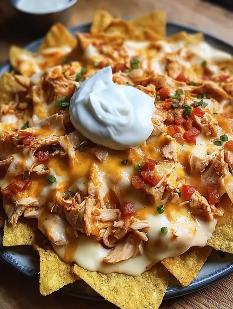Diese cremigen Hähnchen-Nachos sind der ultimative Snack! Saftiges, scharf gewürztes Hähnchen trifft auf knusprige Chips und eine schmelzende Käsehaube – unwiderstehlich einfach.
