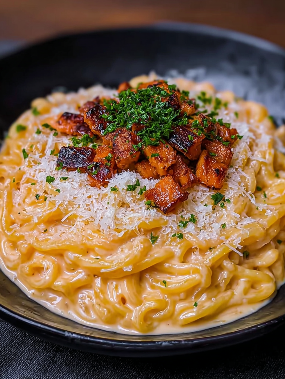 Das Geheimnis dieses Fusionsgerichts liegt im Ersatz des traditionellen Schweinefleischs durch eine ebenso würzige, knusprige Alternative: geräucherte und intensiv angebratene Hähnchenbrust. Diese liefert den notwendigen Rauchgeschmack und das Salz, ohne die Grenzen unserer diätetischen Vorgaben zu überschreiten. Bereiten Sie sich darauf vor, sich von Ihrem alten Pasta-Repertoire zu verabschieden. Dieses Gericht ist der neue König der schnellen Wohlfühlküche.