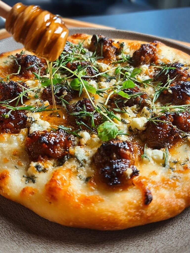 Diese göttliche Kombination entstand, als ich hungrig alle Reste zusammenwarf: scharfe Hähnchenwurst traf cremigen Ricotta und wurde schließlich von einem mutigen Schuss Honig abgerundet. DieEinfache, heiße Wurst-Ricotta-Honig-Pizzawar geboren, eine zufällige Geschmacksexplosion, die meinen langweiligen Dienstag sofort in ein kulinarisches Fest verwandelte.