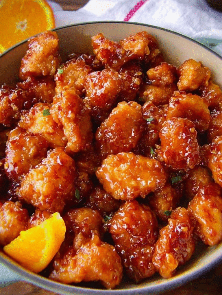 Sobald die Hähnchenstücke fertig sind, geben Sie sie in eine große Schüssel. Gießen Sie die Orangen-Glasur darüber und schwenken Sie alles vorsichtig, bis jedes Stück glänzend überzogen ist. Das Gebackene Orangen-Hähnchen ist nun bereit zum Servieren.