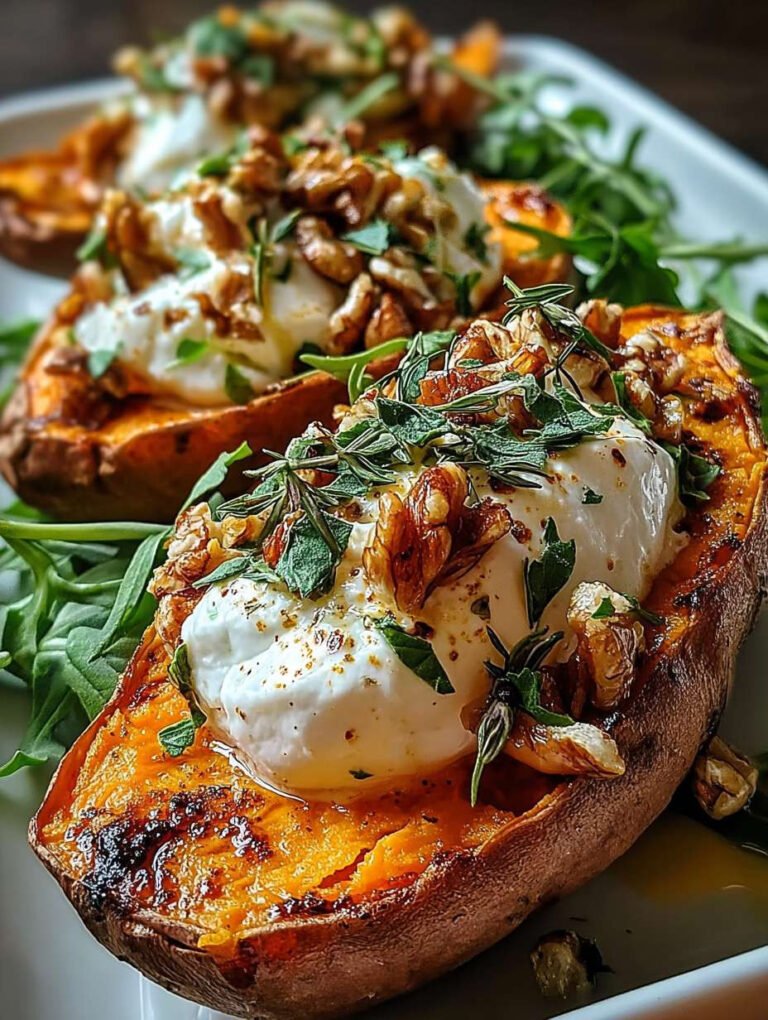 Gefüllte Süßkartoffeln mit Burrata sind ein köstliches und nahrhaftes Gericht, das sowohl als Hauptspeise als auch als Beilage serviert werden kann. Die Kombination aus der natürlichen Süße der Süßkartoffeln und dem cremigen Geschmack der Burrata ist einfach unwiderstehlich.