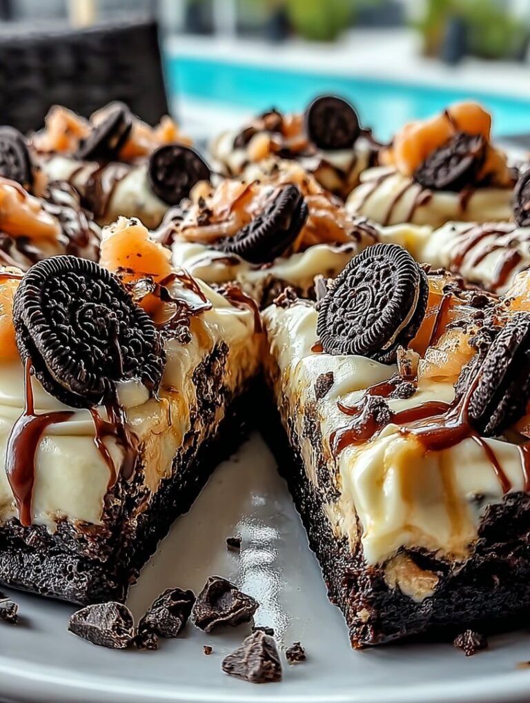 - Optisch ist diese Oreo Fudge Brownie Pizza ein absoluter Hingucker auf jeder Feier, dekoriert mit ganzen Keksen und einer glänzenden, spiegelnden Schokoladenglasur.