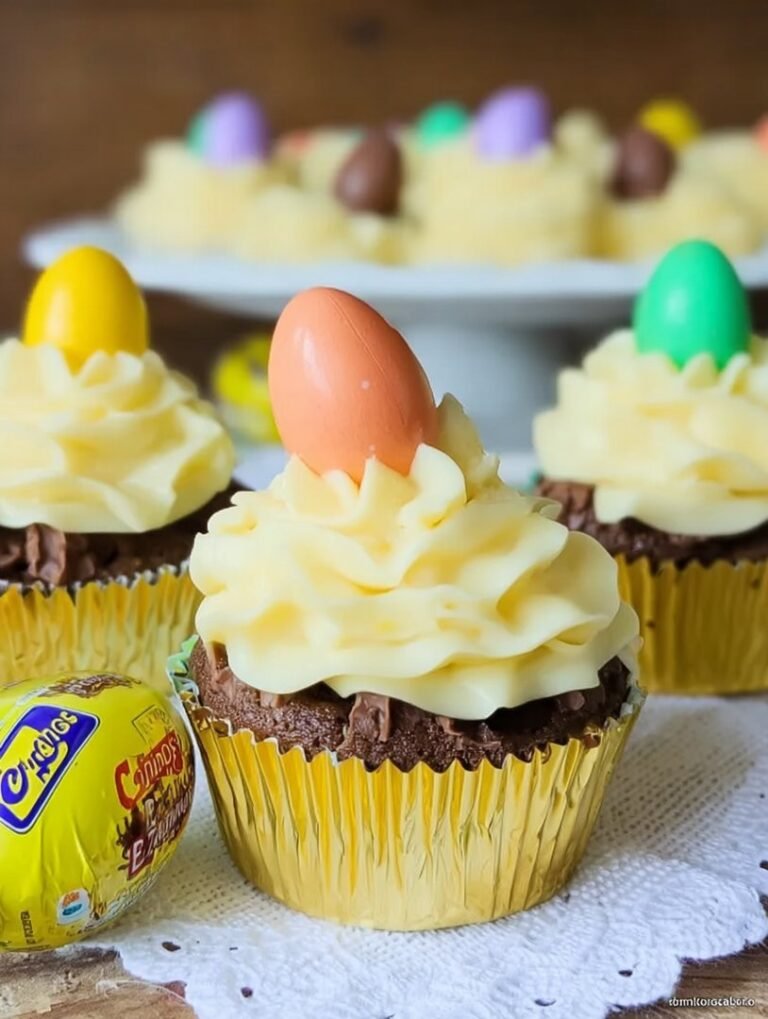 - Step 5: Die Cadbury Creme Eggs entweder halbieren oder vierteln und vorsichtig in die Buttercreme drücken. Servieren Sie die Cupcakes sofort oder lagern Sie sie bis zum Verzehr kühl.