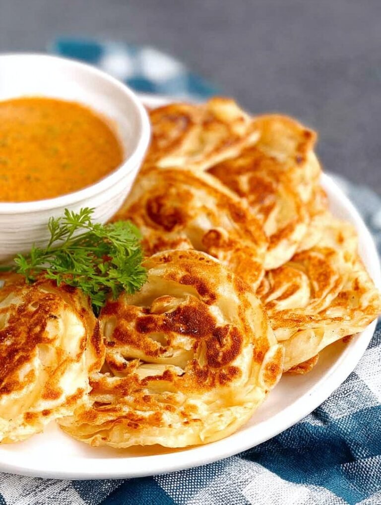Nehmen Sie das fertig gebratene, heiße Roti Canai sofort aus der Pfanne. Halten Sie es in beiden Händen (Vorsicht, heiß!) und drücken Sie die Ränder vorsichtig, aber bestimmt, in Richtung Mitte zusammen. Dieser schnelle „Klatsch“ lockert die inneren Schichten auf und maximiert die Fluffigkeit und Knusprigkeit. Transfer to plates and drizzle with sauce for the perfect finishing touch.