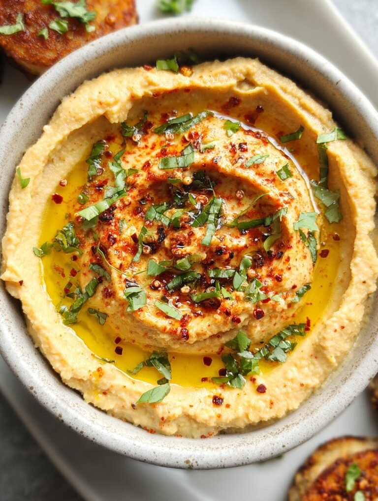 Zum Servieren füllen Sie den Hummus in eine Schale, formen eine kleine Mulde in der Mitte und beträufeln ihn großzügig mit hochwertigem Olivenöl. Garnieren Sie ihn mit einigen frischen Basilikumblättern oder einer Prise roter Pfefferflocken für eine leichte Schärfe.